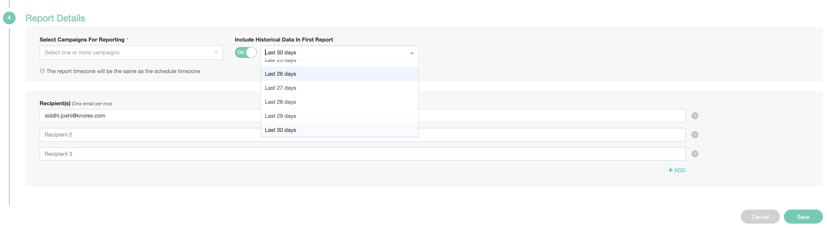 Here you have the option to enable Historical Data in the First Report. If enabled, you can select the past duration between 1 to 30 days. The report timezone will be the same as the timezone selected in the schedule.You can still edit a report once it is saved. However, you will NOT be able to remove a campaign once you have added it to the report. This is applicable to the Delivery Methods, Email and Data Studio.