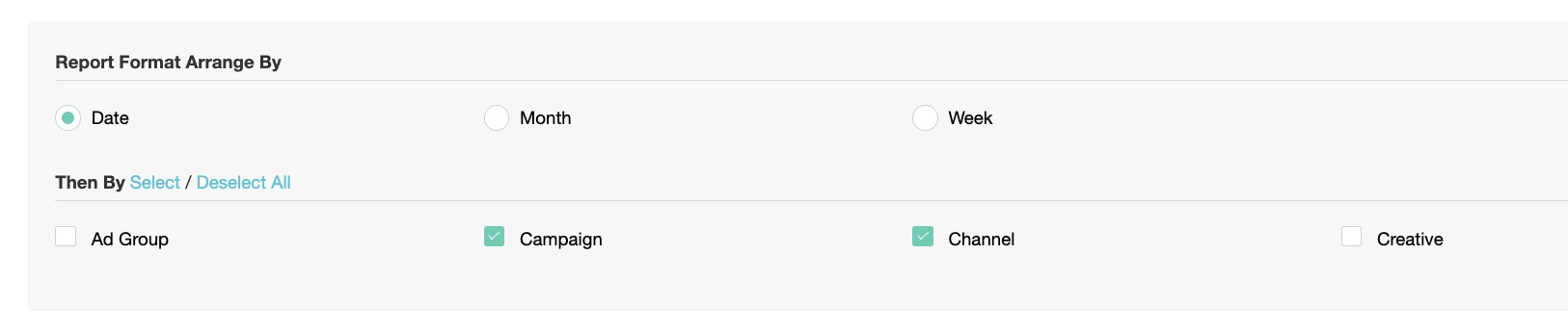 B. Then By - This option helps to arrange the data by Ad Group, Campaign, Creative, and Channel.