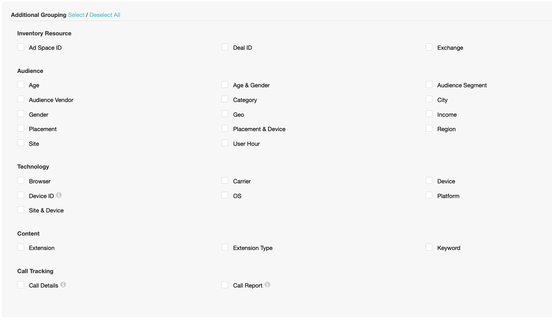 C. Additional Grouping is where you can group the report data by different resources and targeting options. The breakdown includes: