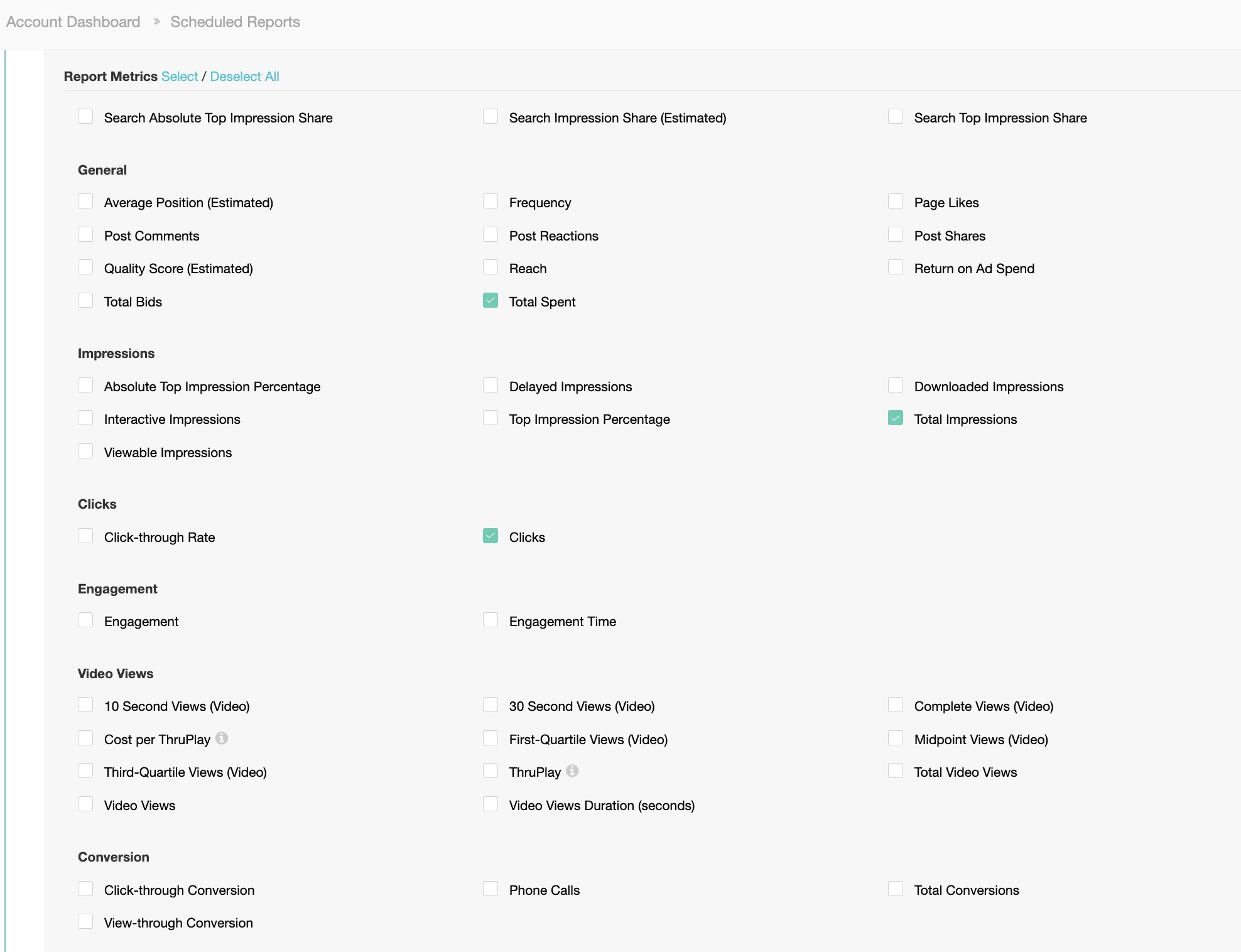 D. Select your Report Metrics for each scheduled report.