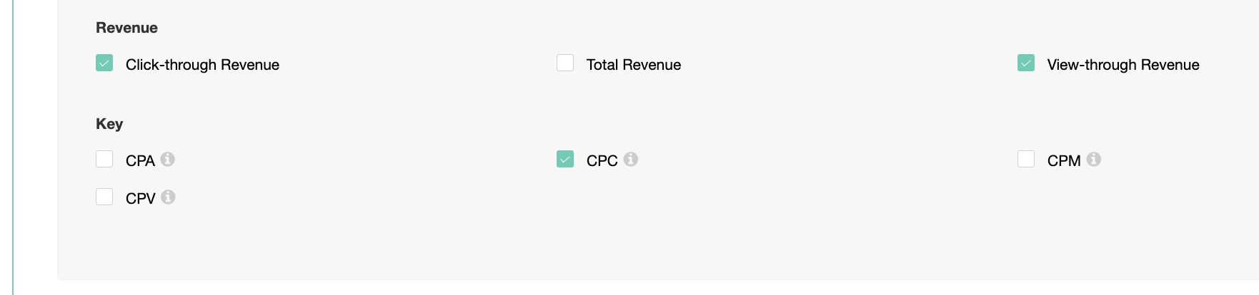 - Report Groups by Metrics. You can control the data representation of your report by using the below options: