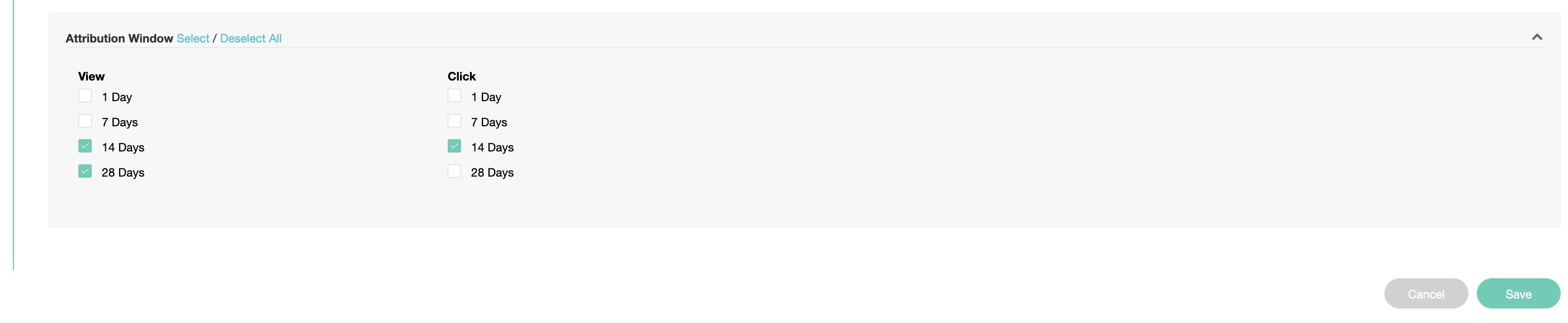 - Click - 1 Day, 7 Days, 14 Days, 28 Days