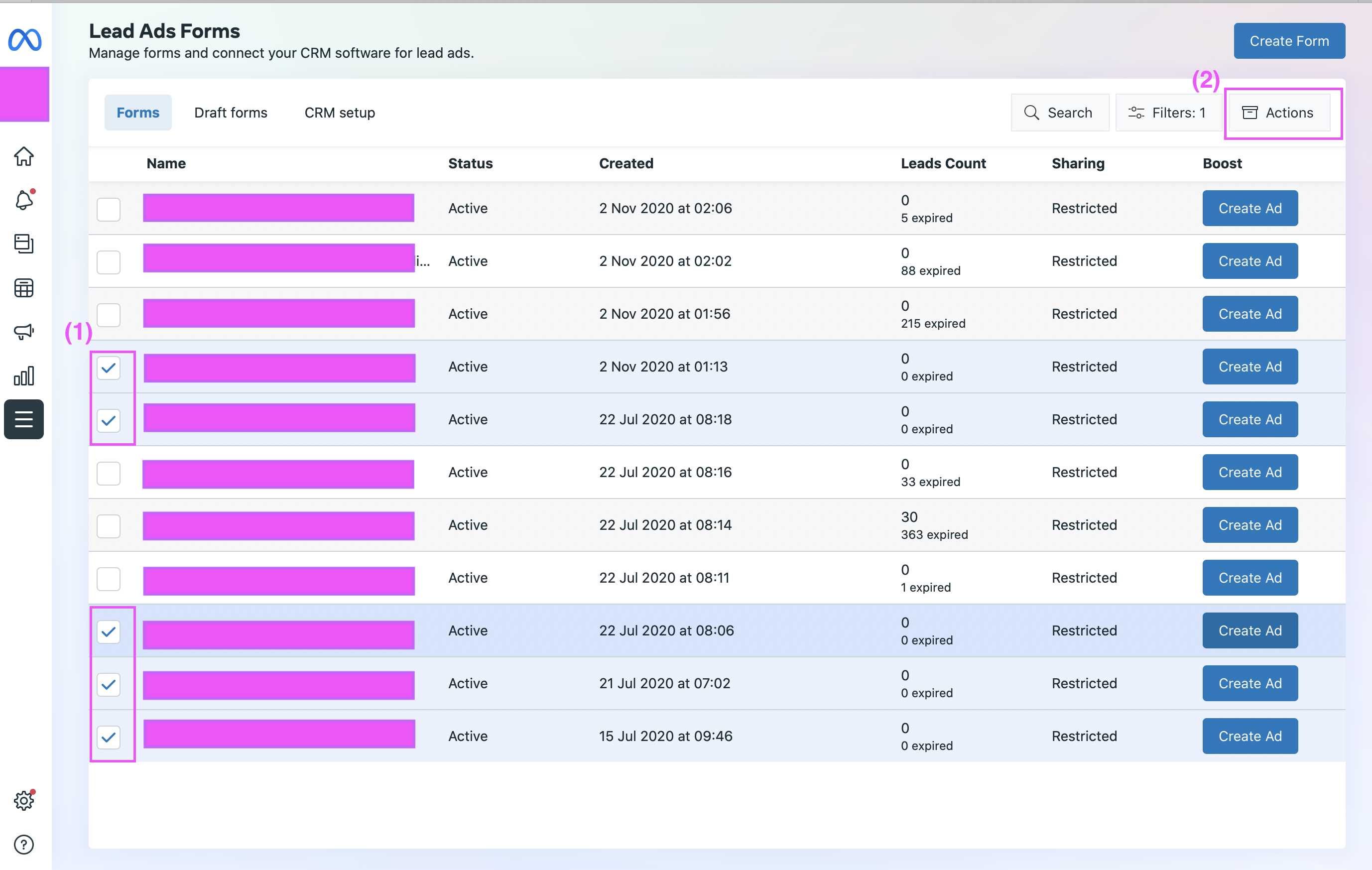- Here, we have several forms which we have created. We would like to archive them to reduce clutter (NOTE: Facebook does not support delete for this). Select one or more forms, and click Actions. A message will pop up asking you to archive them. Click Apply.